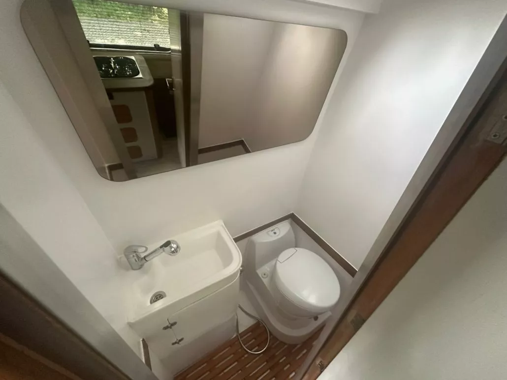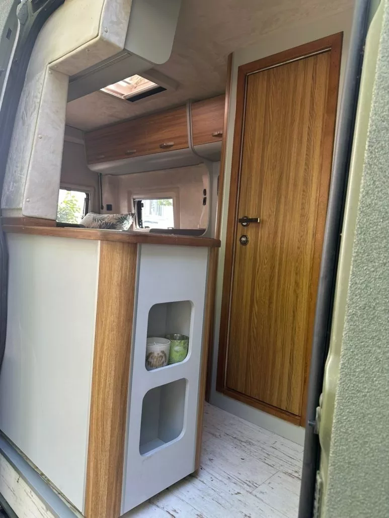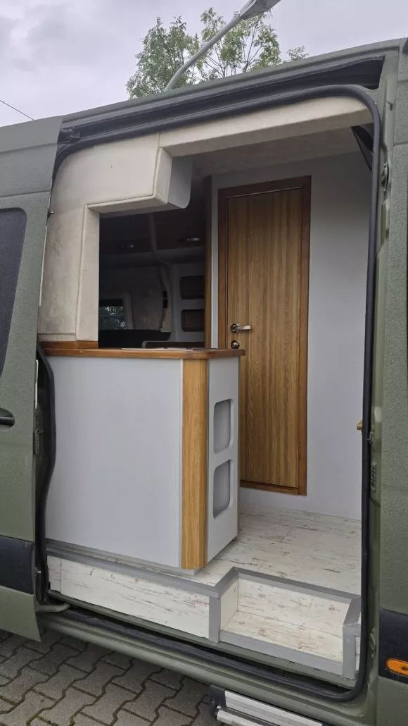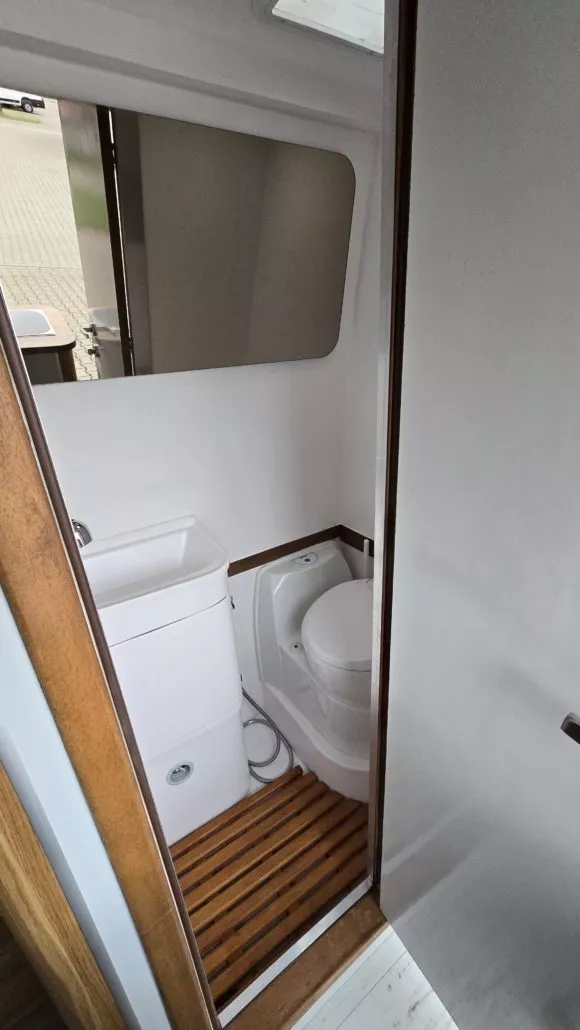 Das Bad ist komplett ausgestattet mit WC und Dusche – kein Kompromiss, kein Campingplatzstress. Alles an Bord, alles für dich.