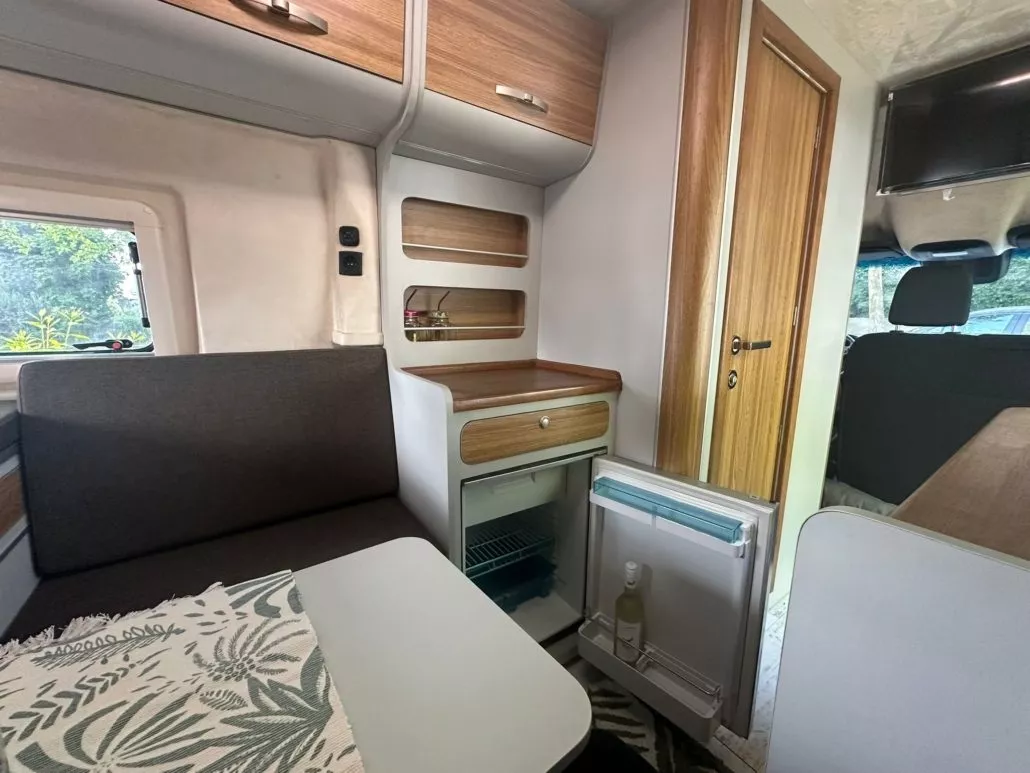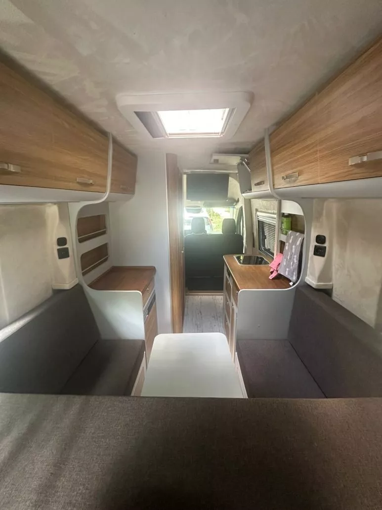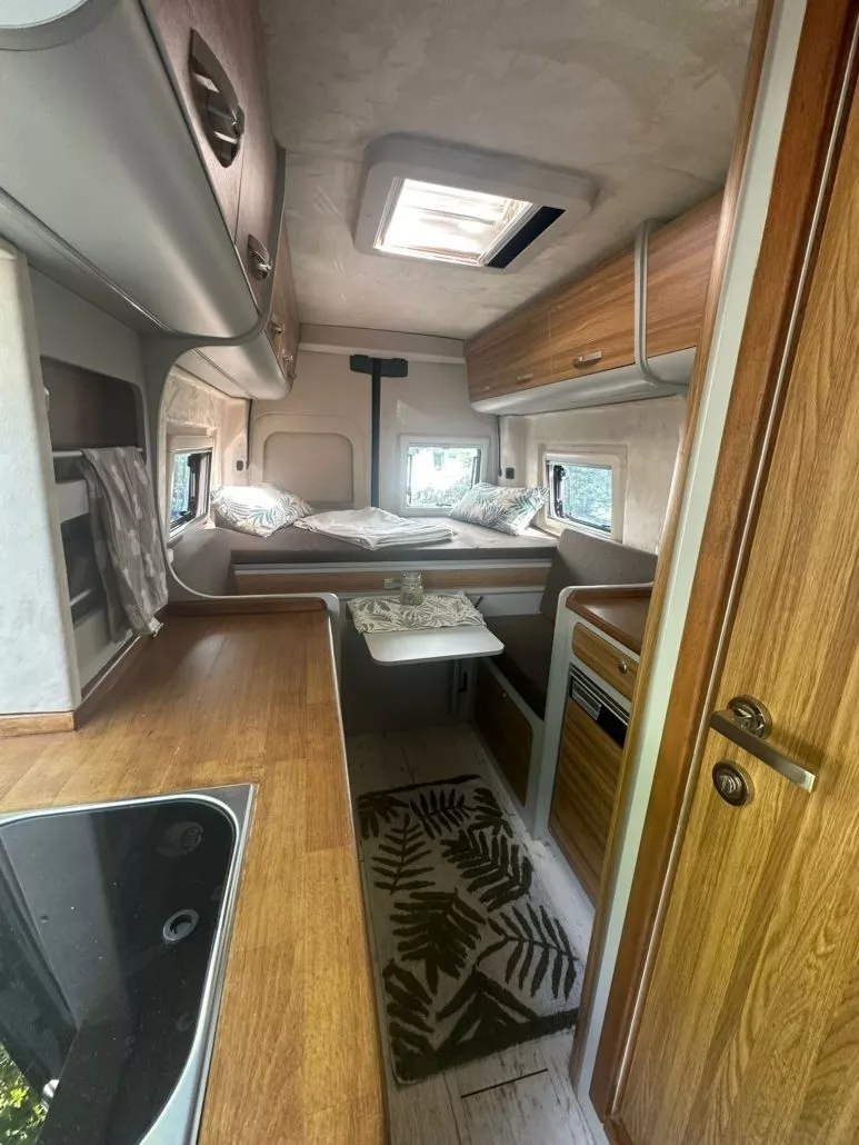Dank der Solaranlage und Dieselstandheizung mit Warmwasserboiler ist Jade komplett autark – Strom, Wärme, Wasser: alles unabhängig. So kannst du auch mal länger an deinem Lieblingsplatz bleiben, mitten im Grünen, mit Blick auf den See oder die Berge. Der 80-Liter-Frisch- und Abwassertank sorgt für genügend Vorrat, und mit der grünen Umweltplakette bist du auch in Städten willkommen.