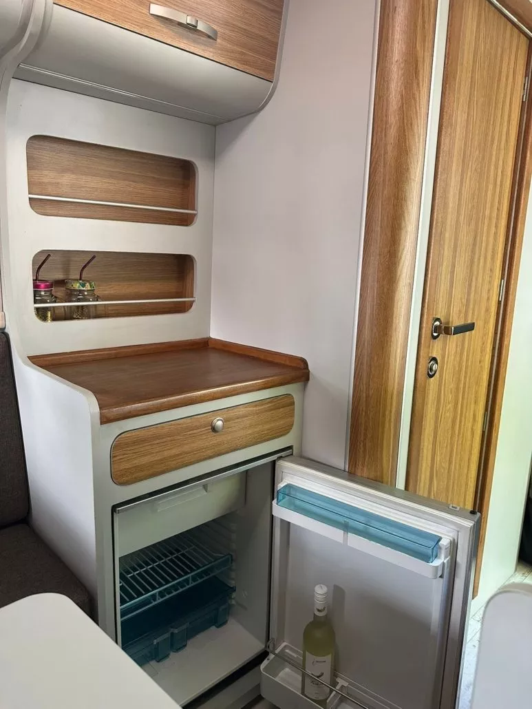 Im Inneren wartet ein clever durchdachtes Raumwunder: eine voll ausgestattete Küche mit Kochfeld, Kühlschrank inklusive Eisfach und allen nötigen Küchenutensilien. Ob du morgens Kaffee kochst oder abends Nudeln unter dem Sternenhimmel – in Jade fühlt sich selbst einfaches Essen wie Urlaub an.