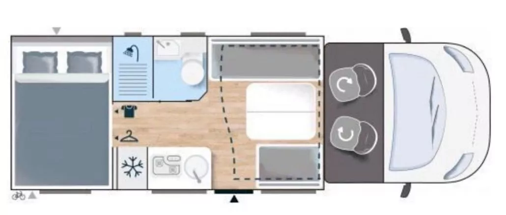 Betten: Heckbett (205 × 150 cm), Hubbett (140 × 190 cm), Dinette (100 × 200 cm, umbaubar)