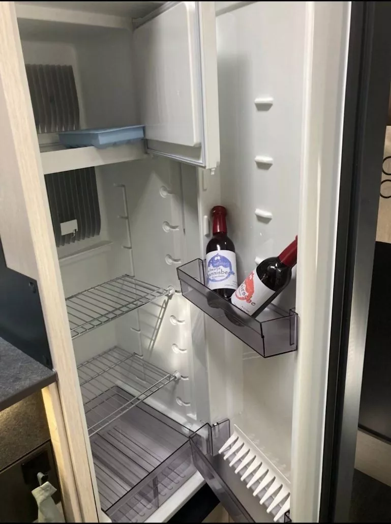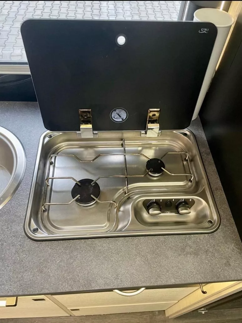 - Küche und EsszimmerVoll ausgestattete Küche mit 2-Flammen-Gaskocher, Spüle und großem 175 L Kompressor-Kühlschrank, Küchenausstattung, Gewürze