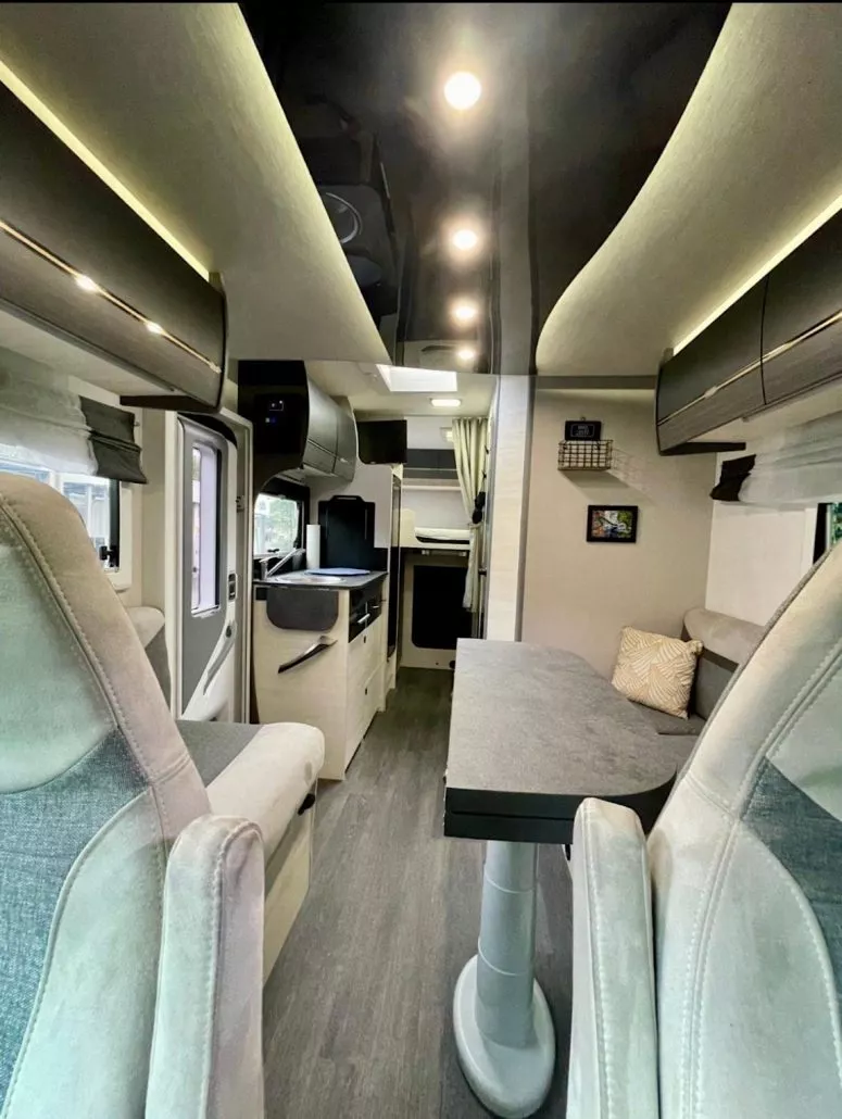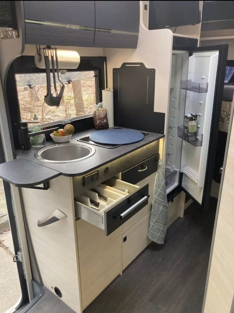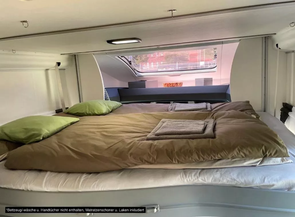Innen erwartet dich ein heller, großzügiger Wohnbereich mit gemütlicher Sitzgruppe, einer voll ausgestatteten Küche und Schlafplätzen für bis zu vier Personen. Und das Beste? Du kannst mit Stella bis zu zwei Wochen komplett autark reisen – dank Solaranlage, Lithiumbatterie und Wechselrichter.
